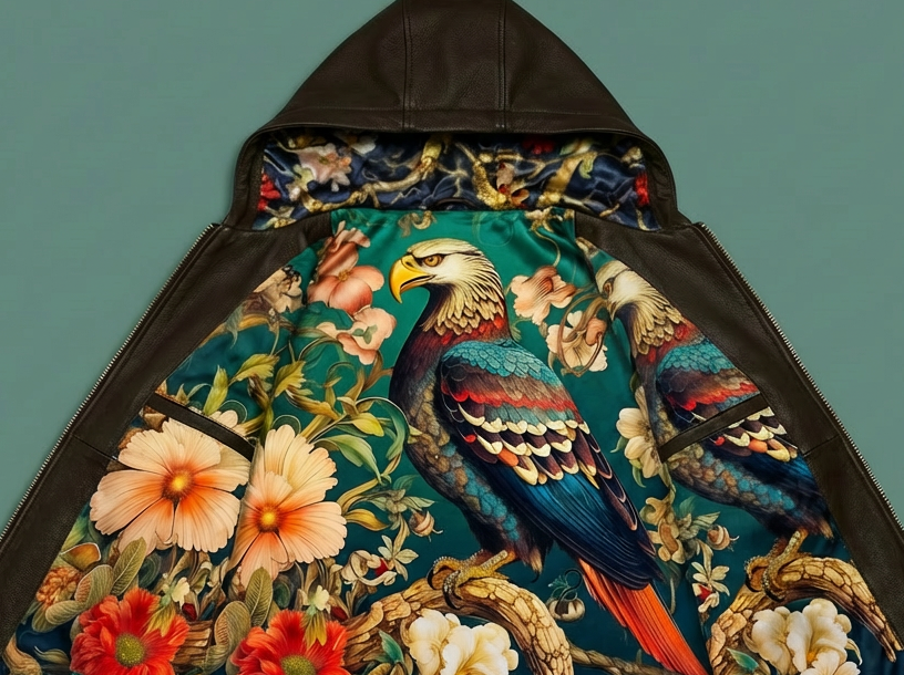 The interior is fully lined with high-definition satin artwork—a botanical explosion of tropical birds, florals, and deep natural tones.