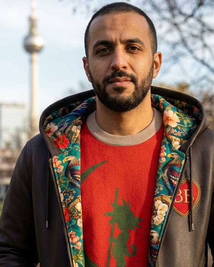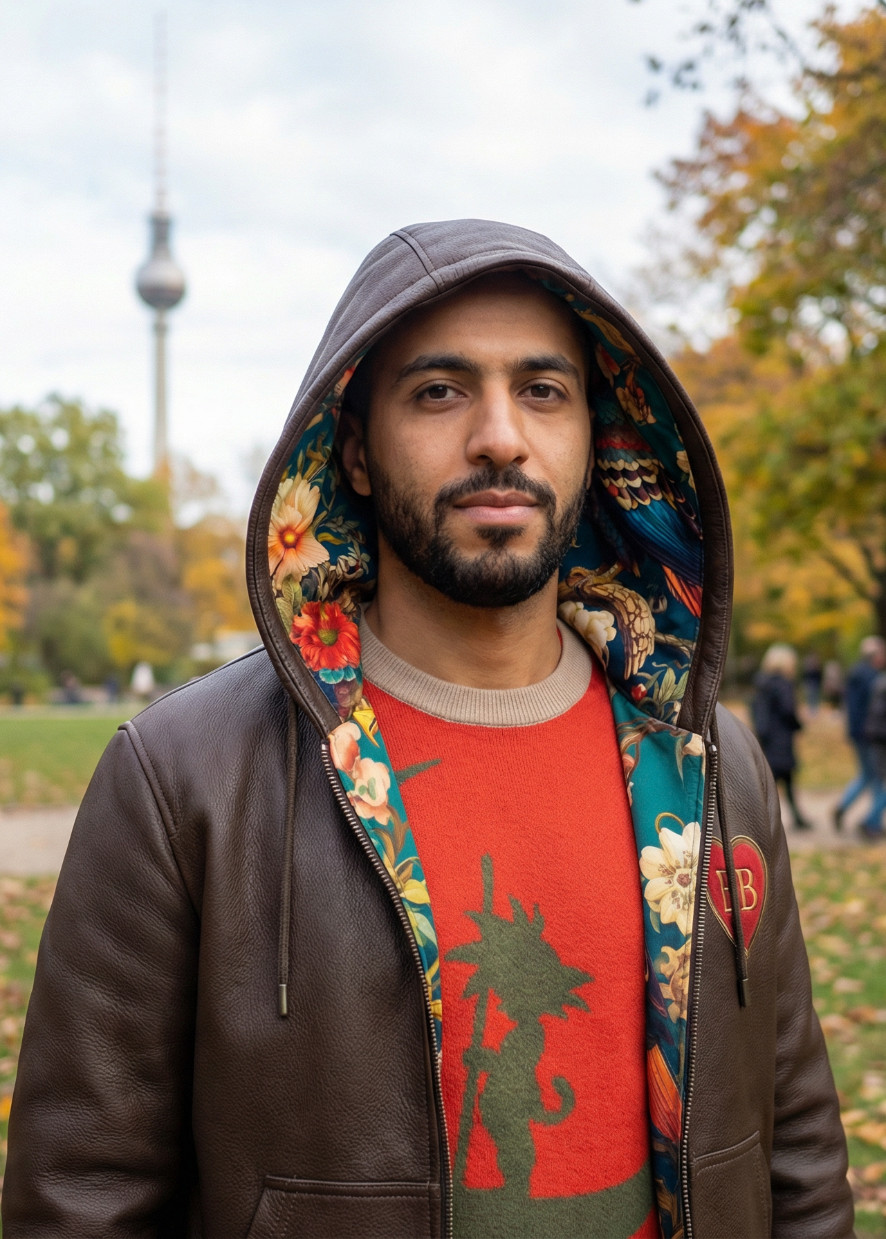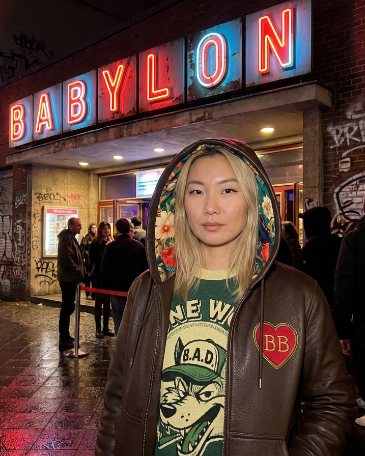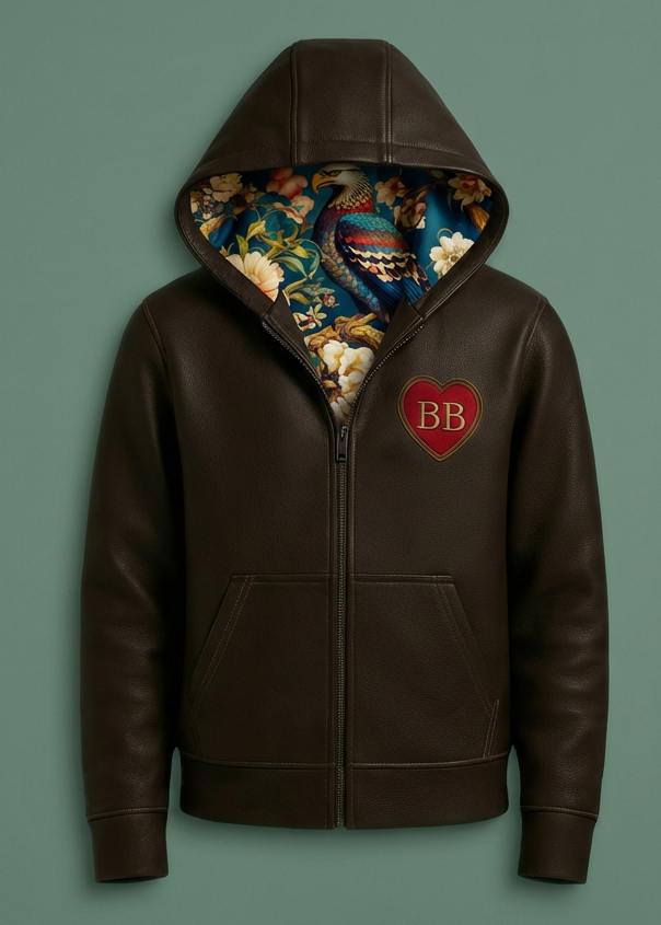 The Heart Guardian is BB SPOKE’s signature leather hoodie — a hand-cut, dark-chocolate pebble-grain piece built for personalized luxury.