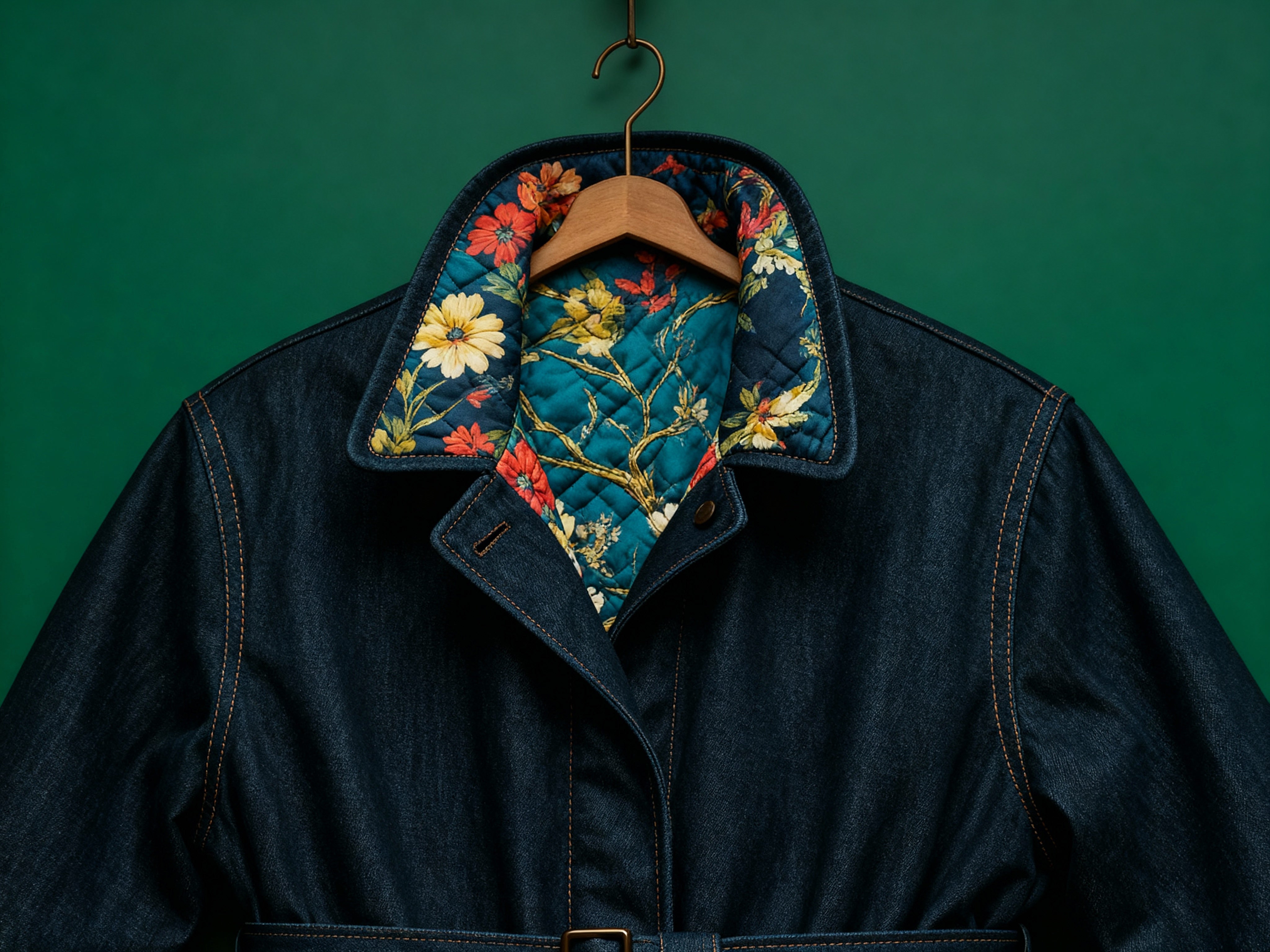 Open it up and the story shifts. Inside, the coat reveals its signature Floral Dynasty quilted lining — a rich tapestry of golden vines, red blossoms, and warm botanical colors blooming across a deep teal backdrop. It’s quiet on the outside, vibrant on the inside: a duality that defines BB SPOKE.