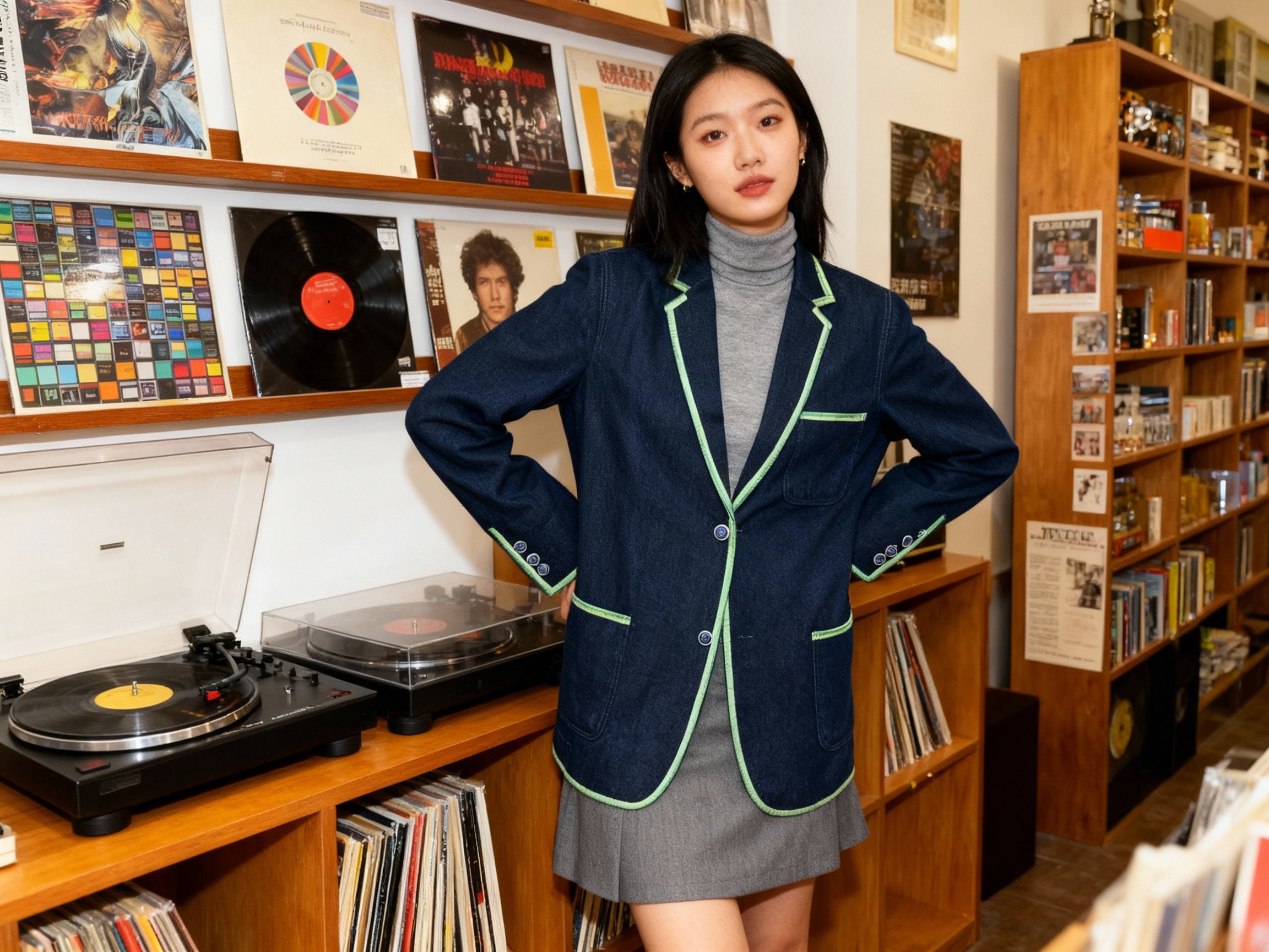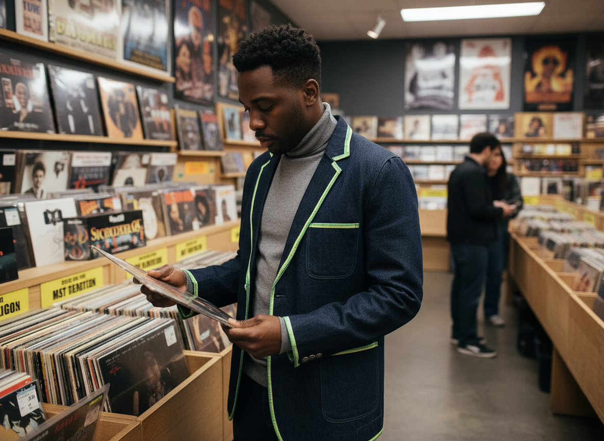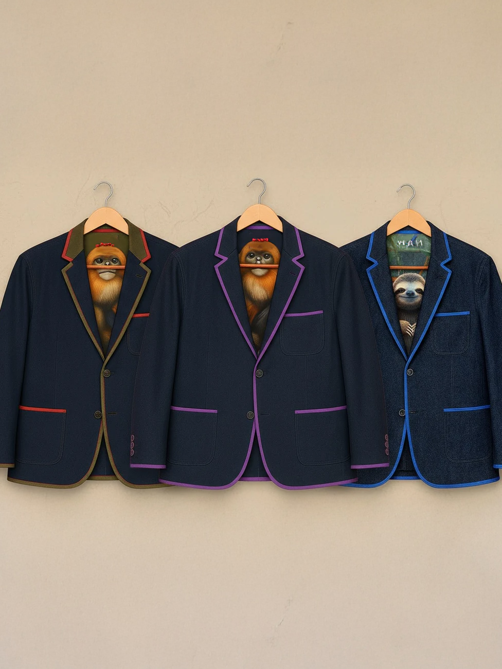 Crafted from premium indigo denim, it features neon green contrast piping along the lapels, cuffs, and pockets — a sharp, electric detail that nods to the boundary between tradition and innovation. Inside, the blazer reveals a custom printed lining — an artful clash of wit, history, and attitude.